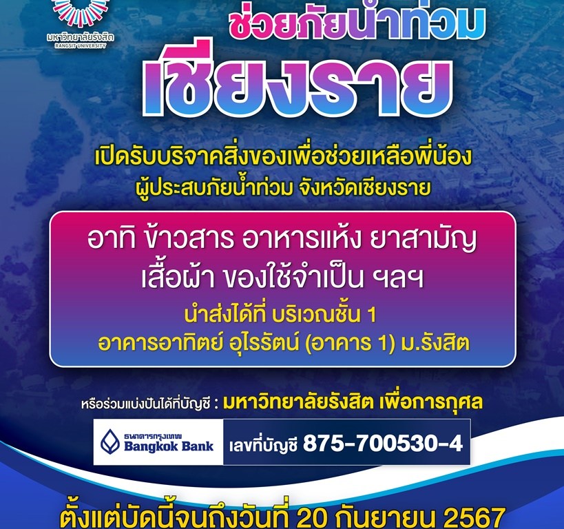 มหาวิทยาลัยรังสิตเปิดรับบริจาคสิ่งของเครื่องใช้ เพื่อช่วยเหลือพี่น้องผู้ประสบภัยน้ำท่วม จังหวัดเชียงราย