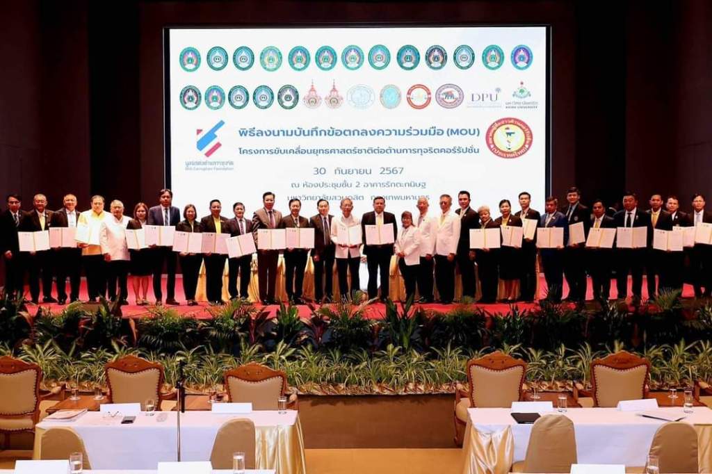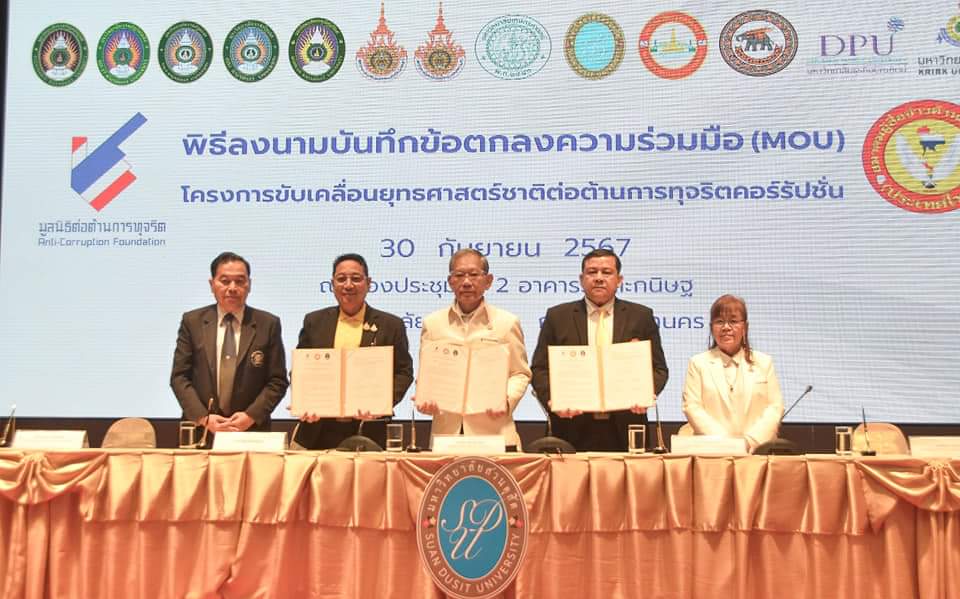ที่มหาวิทยาลัยสวนดุสิต เมื่อวันที่ 30 ก.ย.67 มูลนิธิต่อต้านการทุจริต และสมาคมผู้สื่อข่าวต้านคอร์รัปชั่น (ประเทศไทย) ) จัดแถลงข่าวการลงนามบันทึกข้อตกลงความร่วมมือ (เอ็มโอยู) โครงการขับเคลื่อนยุทธศาสตร์ชาติต่อต้านการทุจริตคอร์รัปชั่น ร่วมกับสถาบันอุดมศึกษา 24 แห่ง โดยมี ศาสตราจารย์พิเศษ วิชา มหาคุณ ประธานกรรมการมูลนิธิต่อต้านการทุจริต เป็นประธาน ดร.เอก์ เหลืองสอาด นายกสมาคมผู้สื่อข่าวต้านคอร์รัปชั่น(ประเทศไทย) และผศ.ดร.พิทักษ์ จันทร์เจริญ รักษาการแทนอธิการบดีมหาวิทยาลัยสวนดุสิต ในฐานะตัวแทนสถาบันอุดมศึกษาทั้ง 24 แห่ง ร่วมด้วย