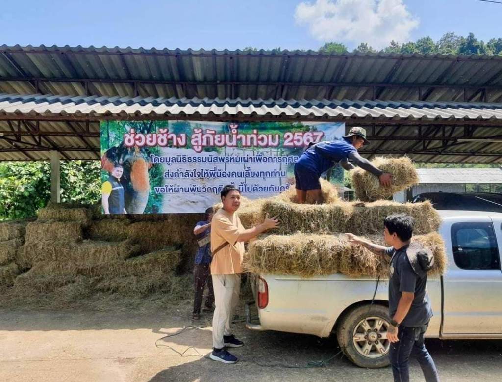 ” ช่วยช้างสู้ภัยน้ำท่วม 2567 วิกฤตครั้งนี้ใหญ่หลวงทั้งคนและช้าง วันนี้ทีมเราเข้ามาช่วยให้อาหารช้างที่ได้อพยพอยู่บนที่สูง ซึ่งขาดแคลนอาหาร โดยมูลนิธิธรรมนัสพรหมเผ่า เพื่อการกุศล“
