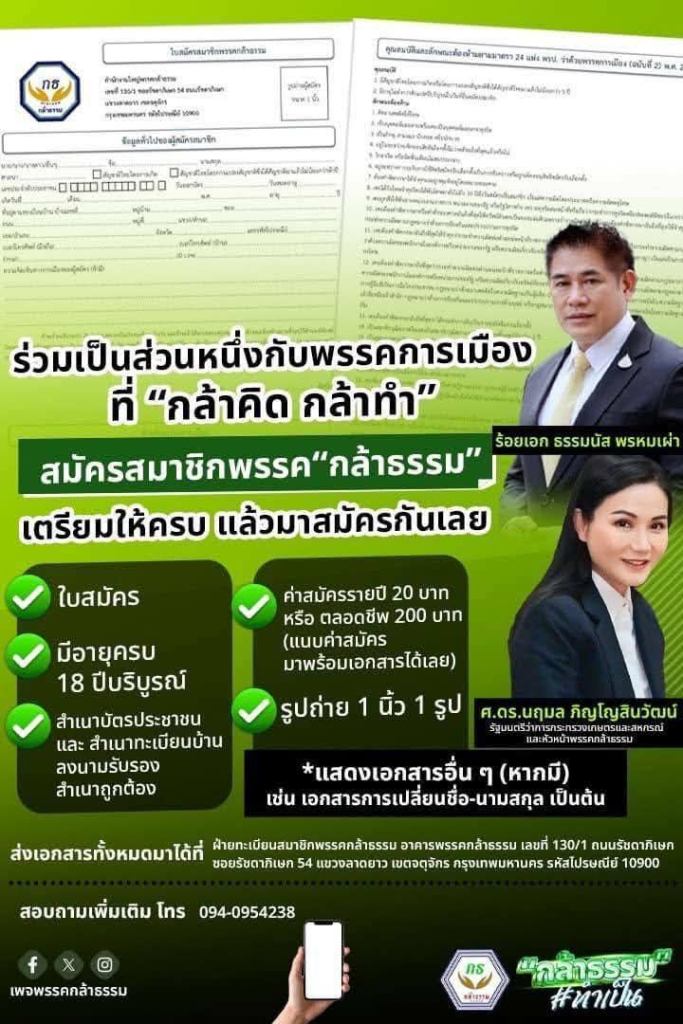เมื่อวันที่ 9 ก.พ.เวลา 08.40 น.ร.อ.ธรรมนัส พรหมเผ่า สส.พะเยา และประธานที่ปรึกษาพรรคกล้าธรรม(กธ.)เปิดเผยว่า ตั้งแต่วันจันทร์ที่ 10 ก.พ.เป็นต้นไป พรรคกล้าธรรมจะเปิดรับสมัครการเป็นสมาชิกพรรค โดยจะเริ่มสร้างตัวแทนของแต่ละจังหวัด และเริ่มหาสมาชิก ตนขอเชิญชวนประชาชนทั้งประเทศมาสมัครสมาชิกกับพรรคกล้าธรรม หากท่านเห็นว่า ผลงานที่ผ่านมาขณะที่ตนเป็นรัฐมนตรีตั้งแต่ปี 2562 จนถึงปลายปี 2567 ตนลงมือทำจริง และกล้ารับผิดชอบในสิ่งที่ตัวเองทำ โดยยึดหลักผลประโยชน์ของประเทศชาติ บ้านเมือง และประชาชน ท่านลองเอาคนฐานรากเข้ามาเป็นแกนนำบริหารประเทศดู เราจะพิสูจน์ให้เห็นว่า เราทำอะไรให้คนไทยได้อย่างไรบ้าง