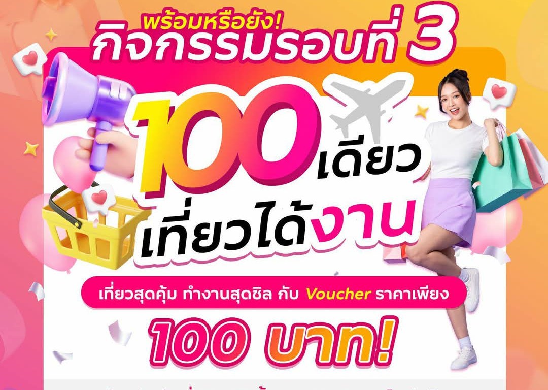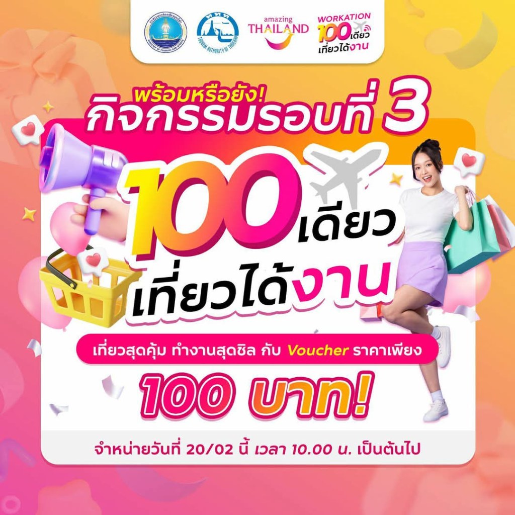 กลับมาอีกครั้ง กับกิจกรรมส่งเสริมการขาย “100 เดียวเที่ยวได้งาน” ซึ่งเป็นกิจกรรมที่นำเสนอสินค้าและบริการด้านการท่องเที่ยวในราคาเพียง 100 บาท เพื่อส่งเสริมการตลาดและกระตุ้นให้เกิด การเดินทางท่องเที่ยวภายในประเทศในวันธรรมดา อีกทั้งยังเป็นการสร้างรายได้ให้กับผู้ประกอบการในอุตสาหกรรมท่องเที่ยว โดยเปิดให้นักท่องเที่ยวเข้าร่วมกิจกรรมรอบที่สองในวันที่ 20 มกราคม 2568 ซึ่งได้รับผลตอบรับเป็นอย่างดี และในรอบต่อไปจะเปิดให้นักท่องเที่ยวเข้าร่วมกิจกรรมได้ในวันที่ 20 กุมภาพันธ์ 2568 และสามารถเลือกซื้อ Voucher ได้ตั้งแต่เวลา 10.00 น. เป็นต้นไป ผ่านเว็บไซต์ http://www.tourismthailand.org/workationthailand ซึ่งมีบัตรกำนัล (Voucher) สินค้าและบริการด้านการท่องเที่ยวที่นำเสนอขายมากมาย หลากหลายประเภท เช่น ประเภทโรงแรมที่พัก อาทิ โรงแรมมาลาดี รองเดวูซ์ เชียงใหม่ โซ โซฟิเทล หัวหิน พันวาบุรี บีชฟรอนท์ รีสอร์ท และอมาธารา เวลเลย์เชอร์ รีสอร์ท ประเภทร้านอาหาร สตาร์บัค ไทยแลนด์และแบล็คแคนยอน ประเภทกิจกรรมท่องเที่ยวและแพ็กเกจท่องเที่ยว อาทิ สวนน้ำโคลัมเบีย พิคเจอร์ส อควาเวิร์ส วานา นาวา วอเตอร์ จังเกิ้ล และโอเอซิสสปา เป็นต้น ทั้งนี้ยังมี บัตรกำนัล (Voucher) สินค้าและบริการด้านการท่องเที่ยวจากสถานประกอบการชั้นนำที่เข้าร่วมกิจกรรมอีกมากมายให้นักท่องเที่ยวได้เลือกซื้อ
