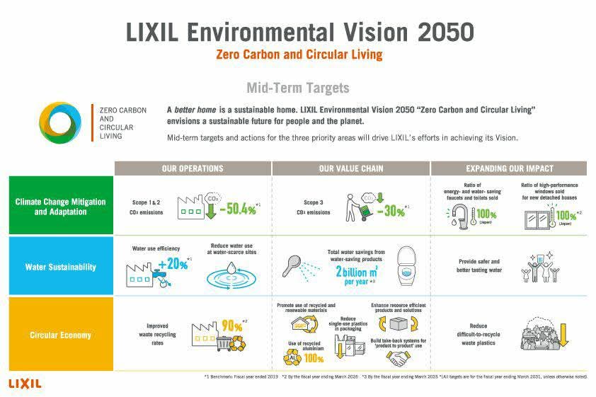 *1 “Beyond foundations: Mainstreaming sustainable solutions to cut emissions from the buildings sector” โดย UNEP ในปี 2019 ลิกซิลได้เปิดเผยวิสัยทัศน์ด้านสิ่งแวดล้อม หรือ LIXIL Environmental Vision 2050 และประกาศพันธสัญญาในการบรรลุเป้าหมาย “Zero Carbon and Circular Living” หรือการมุ่งสู่สังคมคาร์บอนเป็นศูนย์และแนวทางการบริหารจัดการทรัพยากรธรรมชาติอย่างยั่งยืน และในฐานะผู้นำระดับโลกด้านโซลูชันเพื่อการใช้น้ำและที่อยู่อาศัย ลิกซิลจะใช้ศักยภาพและขีดความสามารถขององค์กรในการมุ่งเน้น 3 ด้านหลัก ได้แก่ การบรรเทาและปรับตัวต่อการเปลี่ยนแปลงสภาพภูมิอากาศ (Climate Change Mitigation and Adaptation) ความยั่งยืนของทรัพยากรน้ำ (Water Sustainability) และเศรษฐกิจหมุนเวียน (Circular Economy)