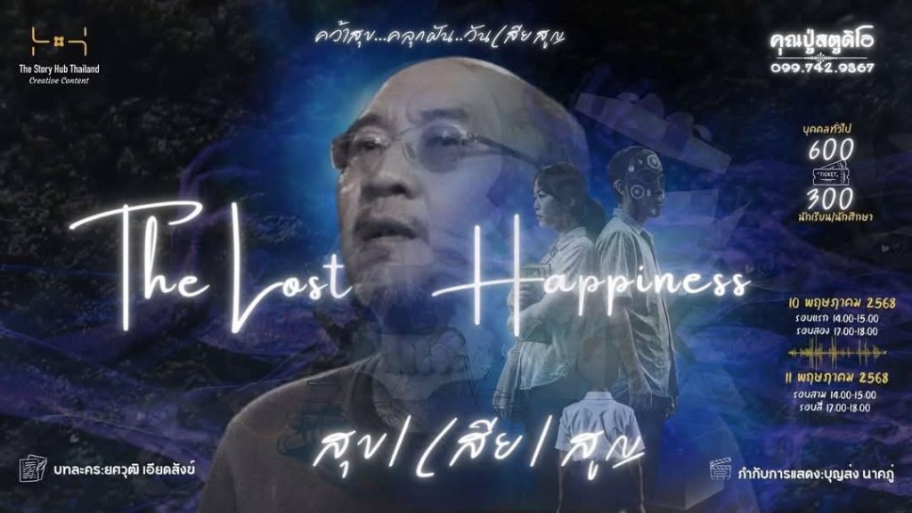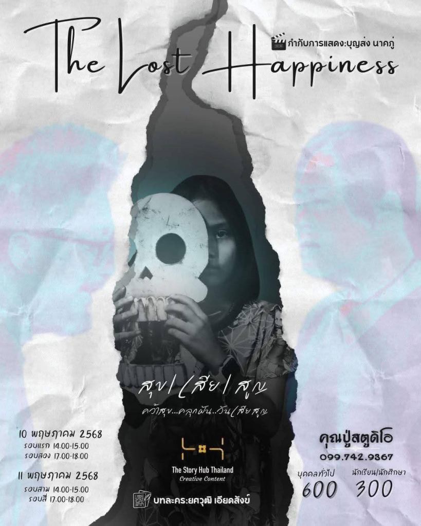 ละครเวทีเรื่อง “สุข/เสีย/สูญ -The Lost Happiness” ผลงานลำดับสอง ของโครงการละครเวทีจาก Story Hub Thailand ที่ก่อตั้งโดย ดร.ฐานชน จันทร์เรือง เพื่อเปิดพื้นที่สร้างสรรค์ให้นักเขียนรุ่นใหม่และศิลปินการแสดง ได้ร่วมกันถ่ายทอดเรื่องราวที่ทรงพลัง และสร้างการเปลี่ยนแปลงเชิงบวกในสังคม โดยจะจัดขึ้นเป็นประจำทุกเดือน