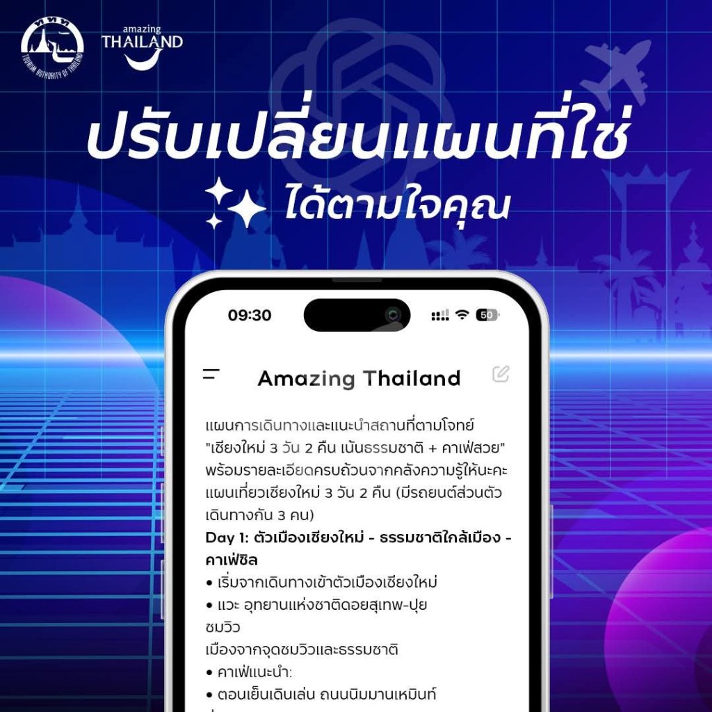 มาร่วมสัมผัสประสบการณ์จริงของการใช้งาน AI Travel Assistant โดย ททท. เปิดโอกาสให้นักท่องเที่ยวที่สนใจสามารถทดลองใช้ Plug-in “Amazing Thailand” ซึ่งจะทำหน้าที่เสมือนไกด์ส่วนตัว คอยแนะนำเส้นทางการท่องเที่ยว ข้อมูลที่พัก ร้านอาหาร กิจกรรมท้องถิ่น ตลอดจนเทศกาลสำคัญได้แบบเรียลไทม์และตรงตามความสนใจของแต่ละบุคคล โดยสามารถทดลองใช้งานได้แล้วที่ https://chatgpt.com/g/g-686679c040e88191b1ba1e18989d3d2e-amazing-thailand