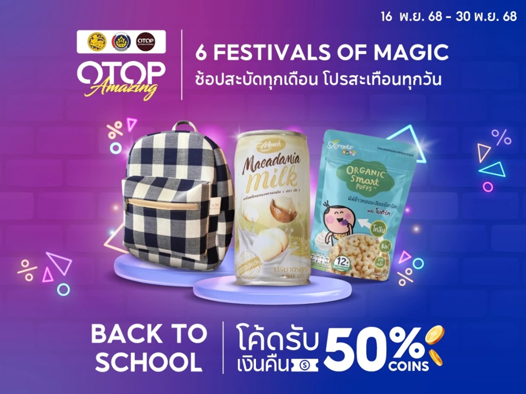 ทั้งนี้ โปรโมชั่นสุดพิเศษตลอดเดือนพฤศจิกายน แบ่งออกเป็น 2 ช่วง ได้แก่ 1–15 พฤศจิกายน 2568 ลด 100 บาท เมื่อช้อปขั้นต่ำ 150 บาท (โค้ด OTOP100) และลด 50 บาท เมื่อช้อปขั้นต่ำ 150 บาท (โค้ด OTOP50) และ 16–30 พฤศจิกายน 2568 รับเงินคืน 50% สูงสุด 50 บาท (โค้ด OTOPCOIN) พร้อมสิทธิ์ส่งฟรีทุกออเดอร์ ไม่มีขั้นต่ำ