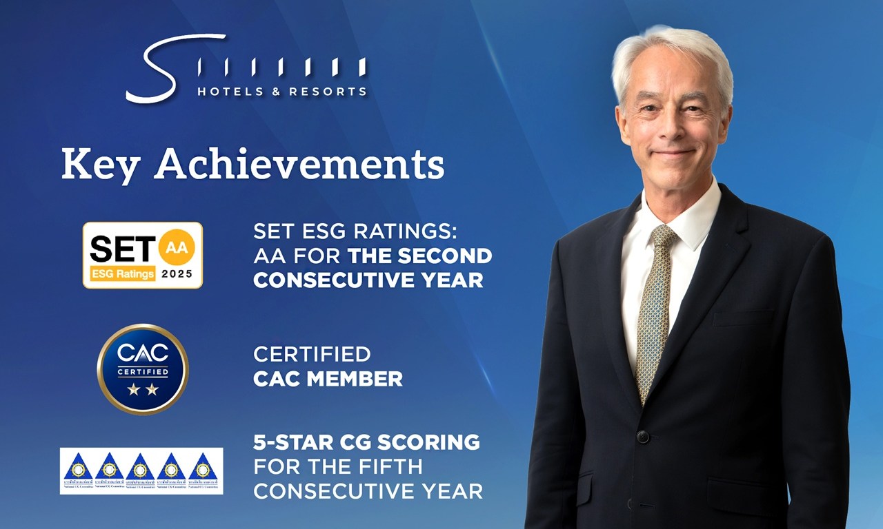 นาย ไมเคิล เดวิท มาร์แชล ประธานเจ้าหน้าที่บริหาร กล่าวว่า “SHR มุ่งขับเคลื่อนองค์กรด้วยกรอบ ESG อย่างจริงจังในทุกมิติ การได้รับเรทติ้งหุ้นยั่งยืนระดับ AA ต่อเนื่องเป็นปีที่สอง ควบคู่กับการได้รับการรับรองเป็นสมาชิกแนวร่วมต่อต้านคอร์รัปชันของภาคเอกชนไทย (CAC) และการรักษามาตรฐานการกำกับดูแลกิจการในระดับ 5 ดาว ต่อเนื่องเป็นปีที่ 5 สะท้อนถึงแนวทางการเติบโตที่ยึดมั่นในจริยธรรม ความโปร่งใส และความยั่งยืน เพื่อสร้างคุณค่าในระยะยาวให้แก่ผู้มีส่วนได้ส่วนเสียและสังคม พร้อมร่วมยกระดับมาตรฐานของอุตสาหกรรมการโรงแรมทั้งในประเทศไทยและระดับโลก”