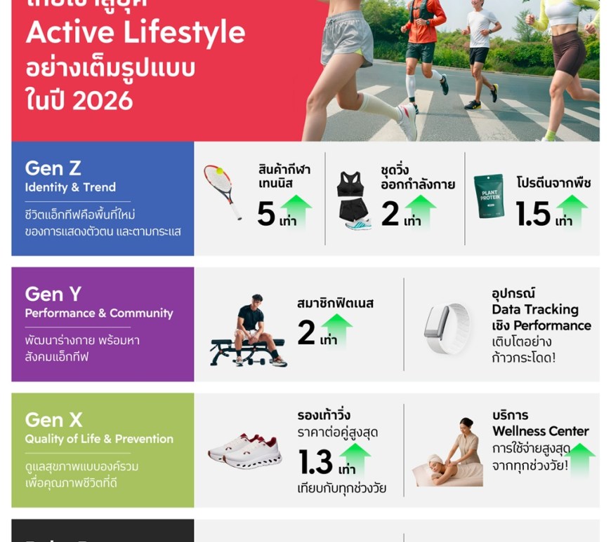 The 1 Insight ชี้ไทยอยู่ในยุค Active Lifestyle ตามเทรนด์โลกปี 2026 อย่างเต็มรูปแบบพร้อมถอดรหัสพฤติกรรมต่างเจนฯ: Gen Z นิยมกีฬาตามกระแส Gen Y สร้างสังคมแอ็กทีฟ Gen X โฟกัสคุณภาพชีวิต ส่วน Baby Boomer เน้น Longevity